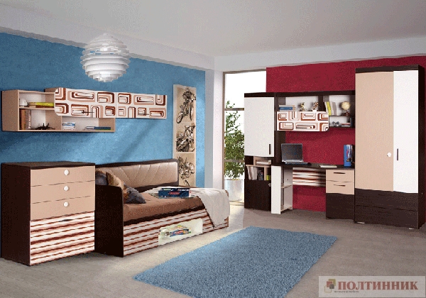Декоры: венге, имбирь, белый, рисунок. Корпус: ЛДСП. Фасады: комбинированные ЛДСП (Lamarty) / МДФ. Обработка торцов: кромка ПВХ. Фурнитура: ручки пластмассовые (пр-ва Италии), направляющие — роликовые (пр-ва России). Основание кроватей: ламели и ДСП. Размеры спального места: 900×2000. Мягкие элементы: искусственная кожа.